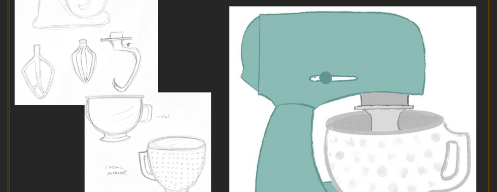 To keep to a soft feel for the mixing bowl I decided to create curves within the design and also have it in a muted duck egg blue sort of colour. For the bowl, I opted for a white/light grey with bumpy feel to add a bit of texture to the design if it were to turn into a finish 3D model.